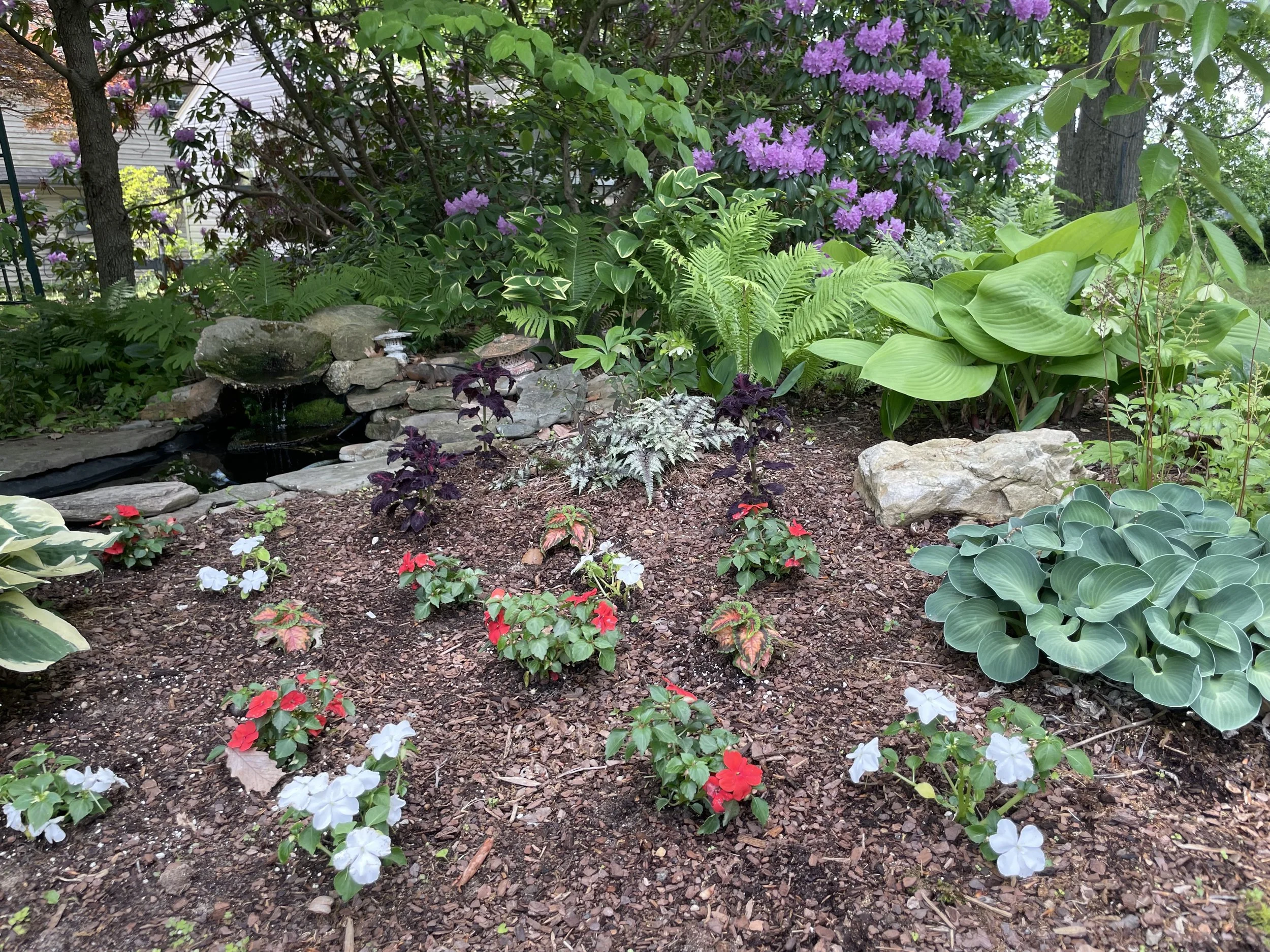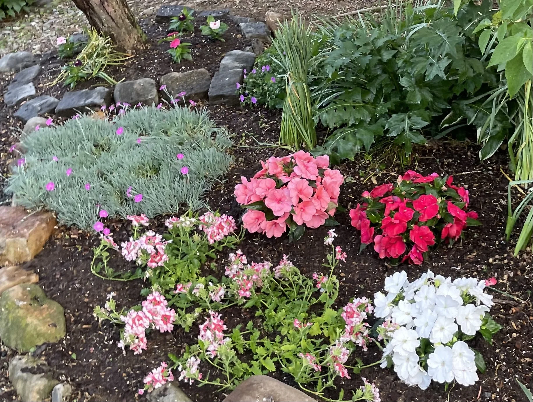 As sunshine warmed the treetops and blossoms unfolded, my yard burst into color so vibrant I could taste it. Azaleas in every hue—deep pink, coral, lavender, pale blush. Rhododendrons flashing red-violet. Peonies—cerise with lemon-yellow centers, bubblegum doubles, or white blooms with ruby hearts. Almost-black bearded iris. Royal Siberian cousins. Sunny yellow siblings. Columbines in raspberry and blueberry. Impatiens from purest white to scarlet. Trailing verbena in blended blush and red. Sun-loving vinca in pale peach and boysenberry. Begonias in bright juicy orange and marshmallow white. Lantana like tequila sunrise with portulaca reflecting it like confetti. Wine-and-roses weigela. Cotoneaster studded with snowflake-like blossoms. A full gallery of green—ferns and hosta, lily-of-the-valley and ornamental grasses, deciduous trees and evergreen arms—layers of leaf and light.